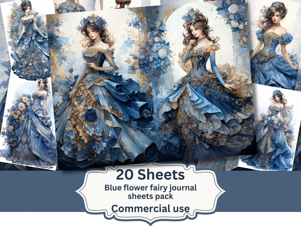 Blue Floral Princess In gala dress journal pages, instant download, digital junk journal, princess